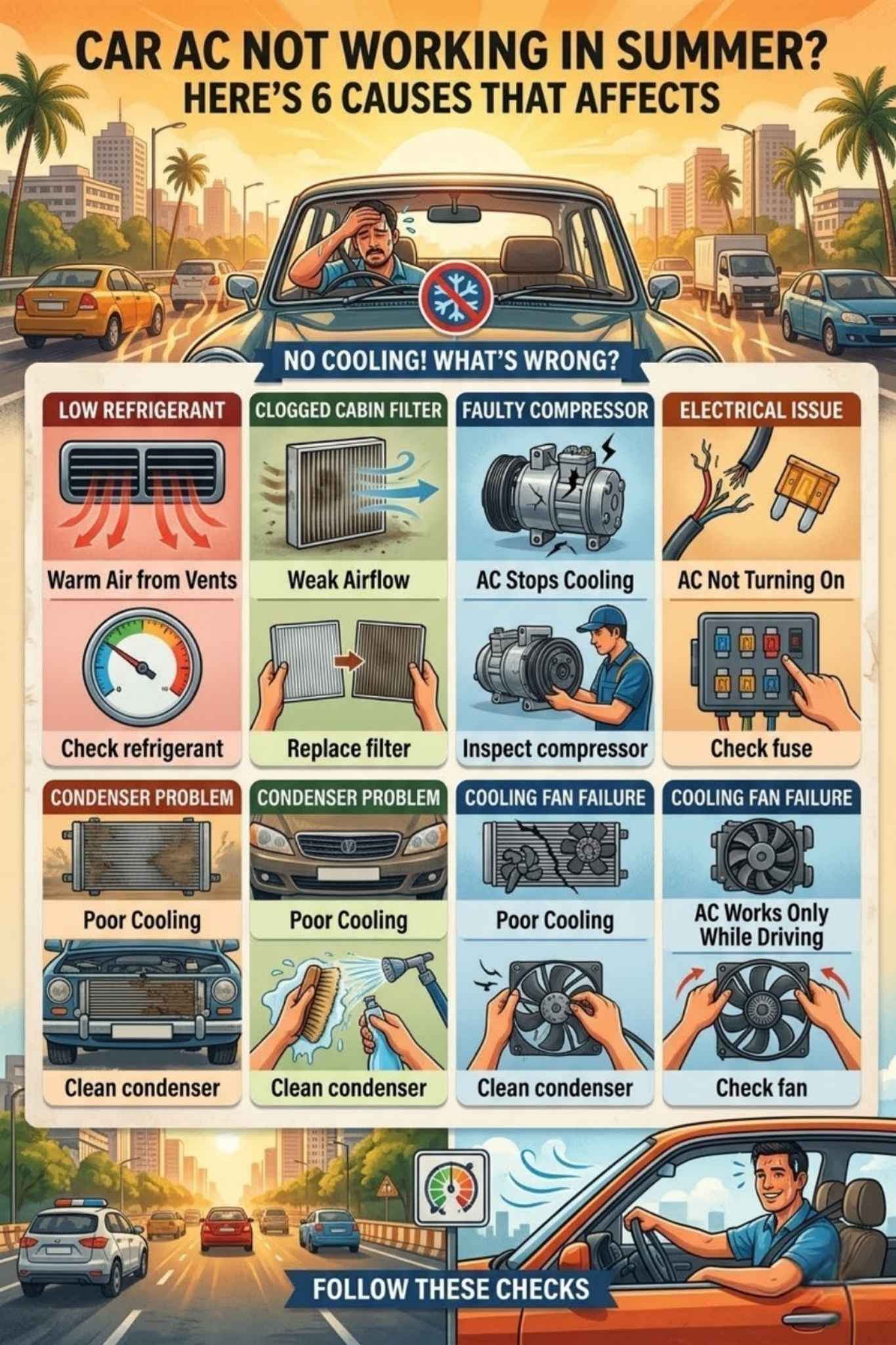 In summer season everyone wants to remain cool and cars in high temperature need cooling for comfort driving & enjoying trips. And when a car AC stops cooling in summer, it doesn’t always mean there is a major mechanical problem. Many cases, the issue is cause by something simple such as low refrigerant, clogged filters, or small electrical faults.