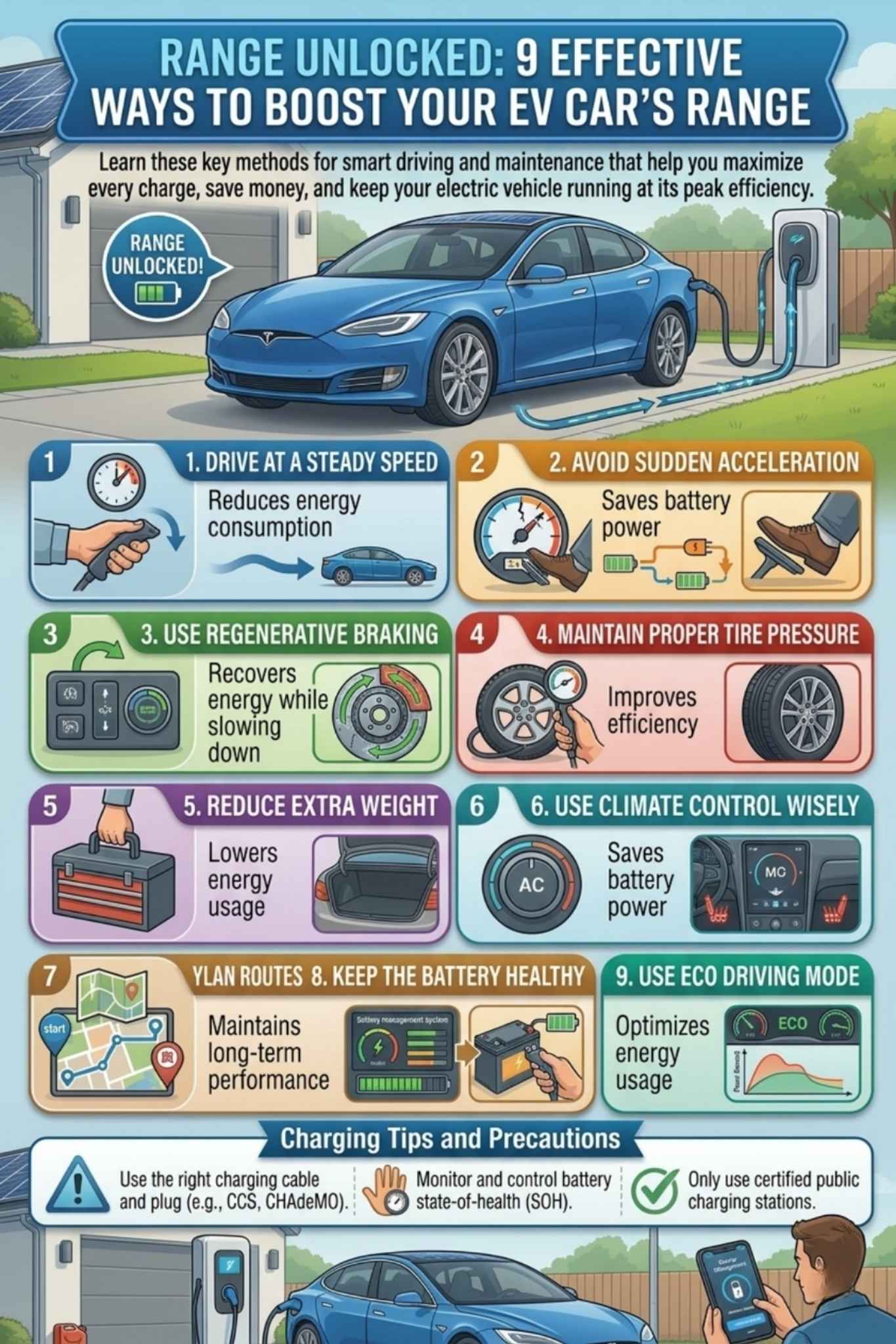 By improving a few daily habits and using the car’s features wisely, you can reduce energy use and increase the distance your EV can travel. These small steps can help you feel more confident while driving and make every charge last longer.
